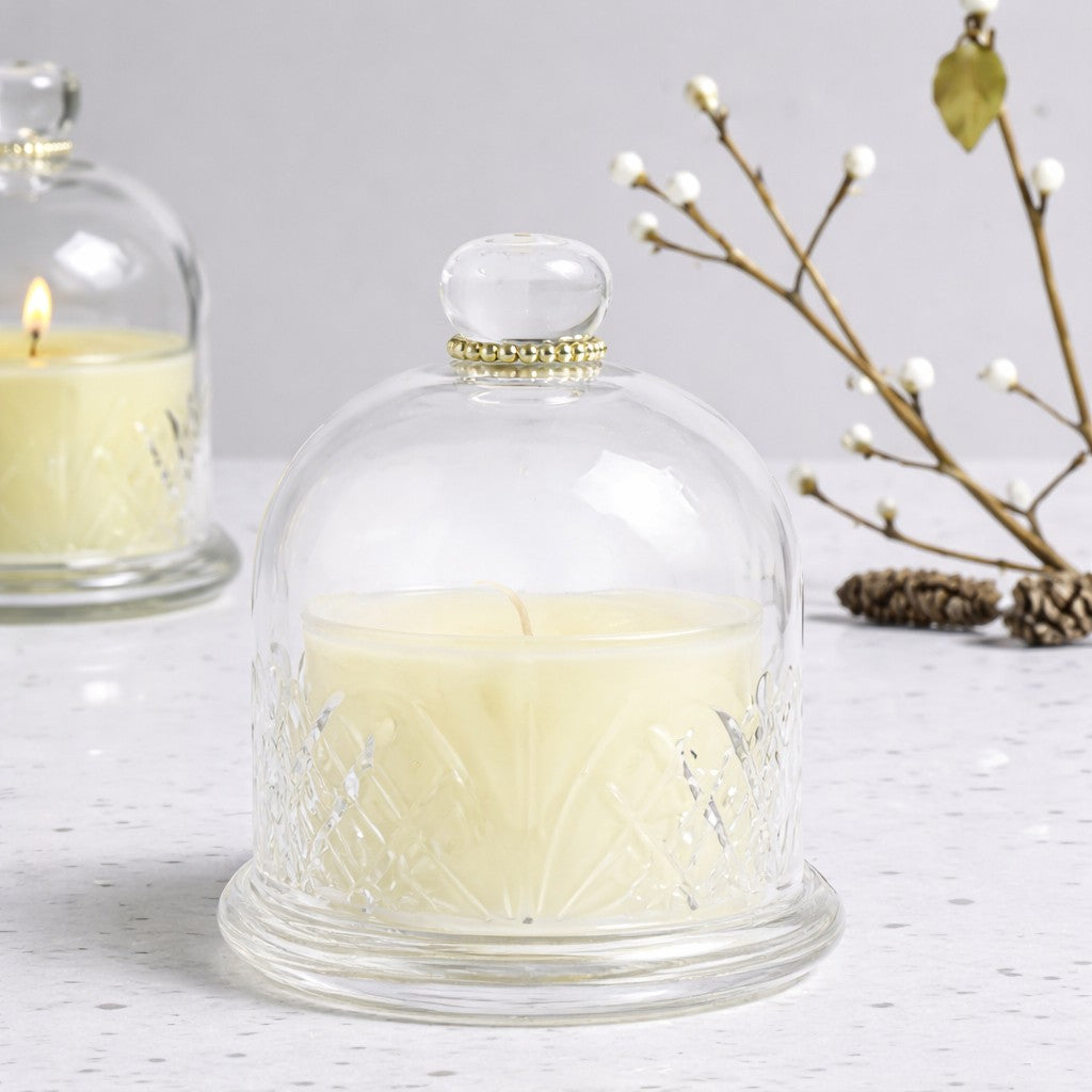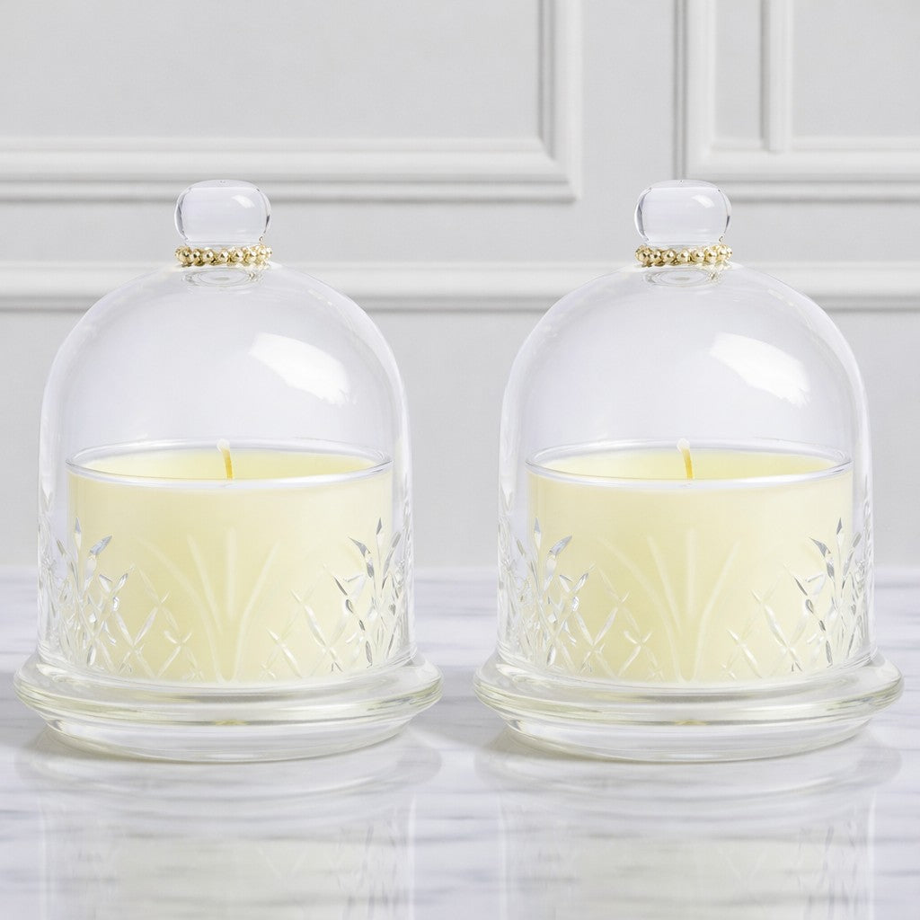 Introducing the Tryst Dome Duo Candle Set, a limited-edition pair that adds unexpected charm with a touch of elegance.  Each Tryst scented candle is housed beneath a crystal-cut glass dome, keeping the candle beautifully cloaked until the moment it is lit and enjoyed. The cloche dome softly enhances the candle’s presence, preserving the fragrance and finish. Ideally suited for vanities, shelves, mantels, or bedside tables, whether illuminated or admired.