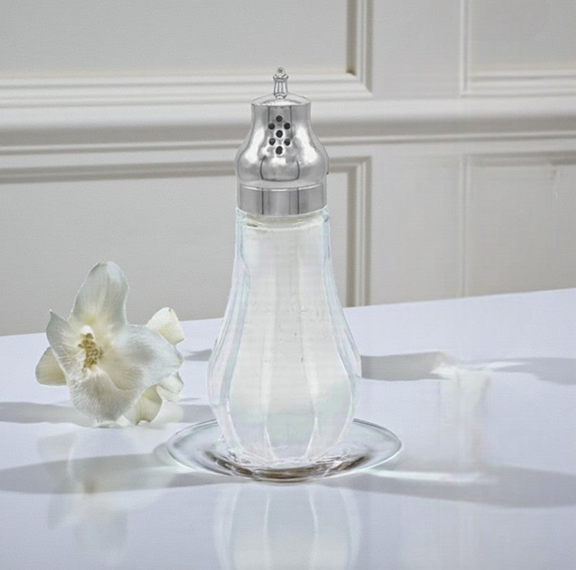 • 4 oz | 7" tall | glass | nickel-plated top tarnish-free | powder is talc-free | Made in USA