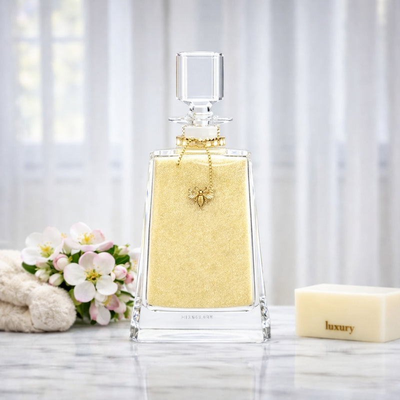 Royal Extract Bath Salts presented in our Grand Decanter. A stunning statement piece designed to elevate your bath vanity, adorned with our gold honey bee.  Standing over 10 inches tall, this exquisite piece brings timeless elegance and refined beauty to your space. These mineral-rich salts help relax and soften the skin while you're enveloped in the warm and romantic fragrance of Royal Extract.