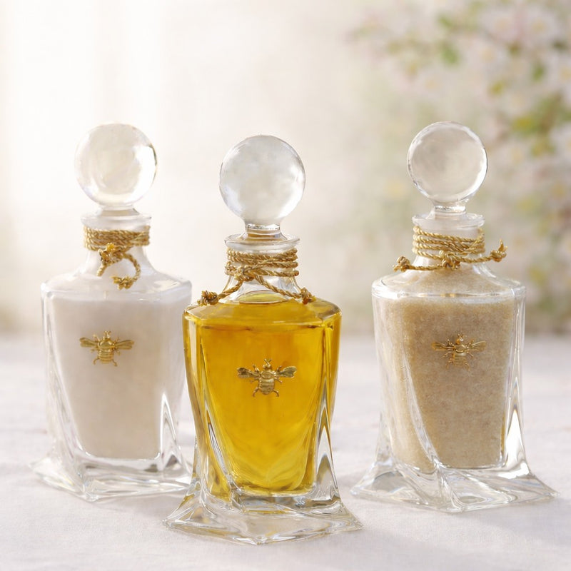 A whimsical trio of petite swirl decanters featuring Royal Extract Bath Salts, Lotion, and Bath Gel. Each elegant vessel is adorned with our hand-applied gold honey bee, creating a charming and regal display. Bath salts soften, bath gel cleanses with honey, and lotion moisturizes, leaving skin delicately scented with Royal Extract.