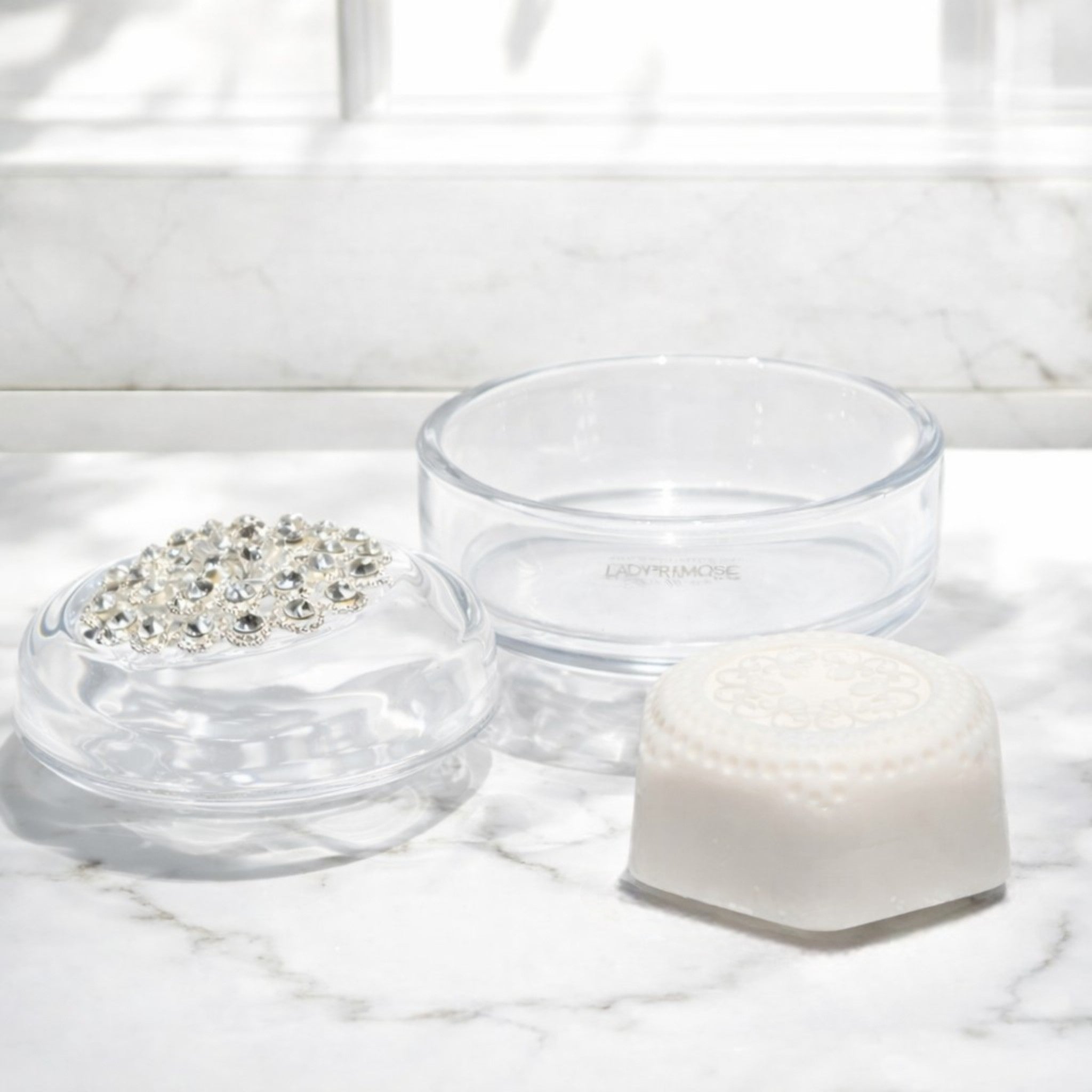 Premiere Crystal Embellished Soap Dish featuring our beloved Lady Primrose White Cream Soap now beautifully expressed within our Premiere collection.  Infused with the iconic Lady Primrose scent customers have cherished for years, this soap first debuted decades ago after 23 meticulous renditions to ensure perfection.  Rich, creamy, and decadent, it delivers a truly luxurious lather in this extraordinary fragrance.  Each soap is carefully poured and infused with gentle moisturizers, blending seamlessly with our signature scent. Back in stock and ready to be enjoyed once again!